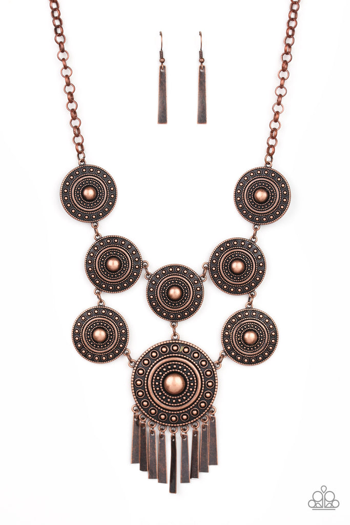 Studded in tactile circular patterns, a collection of antiqued copper disc-like frames connects into a stacked tribal pendant. A larger copper disc is suspended from the bottom, giving way to a fringe of flared copper accents for a noisemaking finish. Features an adjustable clasp closure.